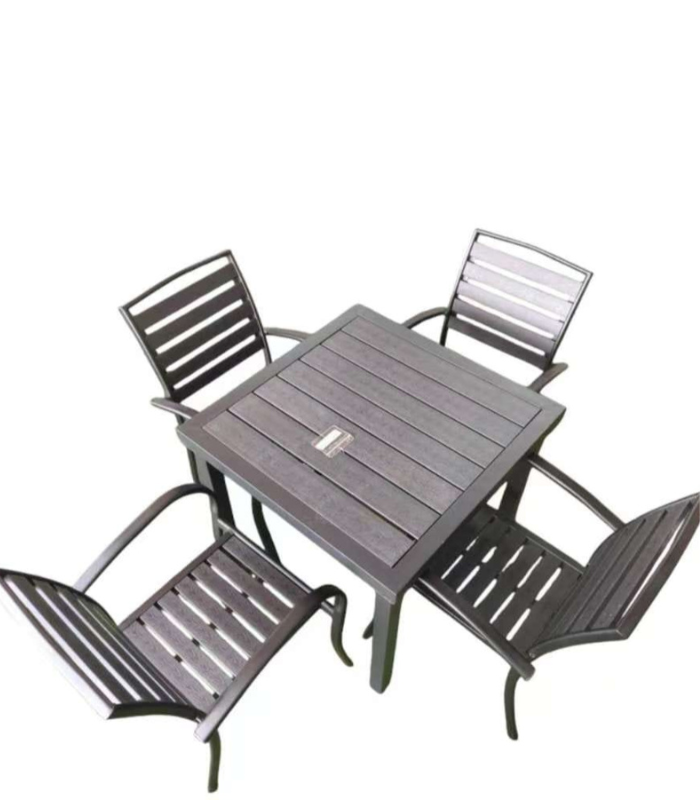 Perfect for smaller outdoor spaces, this elegant 5-piece patio dining set features a stylish square table and four chairs with a sleek, slatted design. Crafted from durable, weather-resistant material, it’s ideal for intimate al fresco dining and brings both style and durability to any balcony or patio.